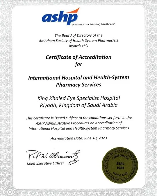 حصل مستشفى الملك خالد التخصصي للعيون على اعتماد الجمعية الأمريكية لصيادلة النظام الصحي(ashp)، كأول مستشفى من مستشفيات وزارة الصحة وأول مستشفى تخصصي في مجال طب العيون يحصل على هذا الأعتماد الذي يعبر عن مدى تميز الخدمات والممارسات الصيدلانية ذات الجودة العالية المقدمة للمريض في المستشفيات بما يتوافق مع معايير الجودة.