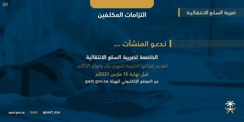 دعت الهيئة العامة للزكاة والدخل المكلفين الخاضعين لضريبة السلع الانتقائية إلى تقديم إقراراتهم الضريبية عن شهرَيْ يناير وفبراير الماضيَيْن، وذلك في موعدٍ أقصاه الخامس عشر من شهر مارس الجاري.