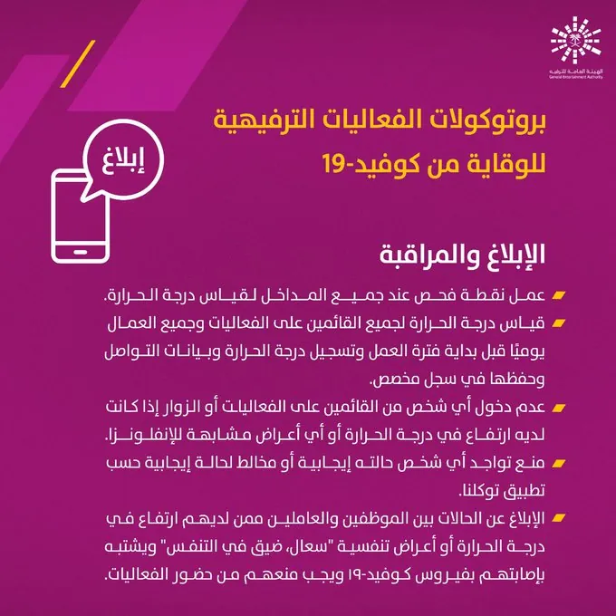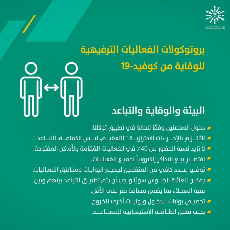 وأضاف أن الوقاية والتباعد عنصر أساسي في بروتوكولات إقامة الفعاليات الترفيهية التي أطلقتها الهيئة لضمان سلامة الجميع.