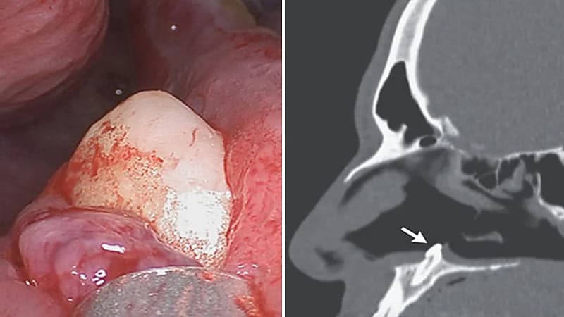 وأجرى الجراحون منظارًا واكتشفوا وجود كتلة بيضاء تظهر من خلال أرضية فتحة الأنف اليمنى ليكتشفوا وجود سن منتبذ يبلغ طوله 15 ملم، والذي يُعرّف بأنه يحتوي على ضرس في مكان غير طبيعي.