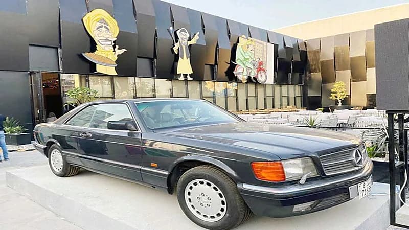 آثارت سيارة قديمة من طراز مرسيدس متوقفة أمام أحد المطاعم في بوليفارد رياض سيتي انتباه الزوار .