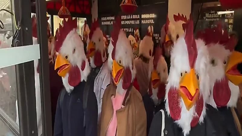 أقدم نشطاء في باريس على اقتحام أحد مطاعم البرجر الشهيرة، مرتدين أقنعة على شكل رأس دجاجة.
