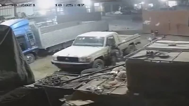 وبدا في الفيديو، المسلح الحوثي يذهب إلى الورشة على متن دراجة نارية وتهديد مالكها، وتبين أن المسلح الحوثي كان يصلح سيارة نقل في الورشة.